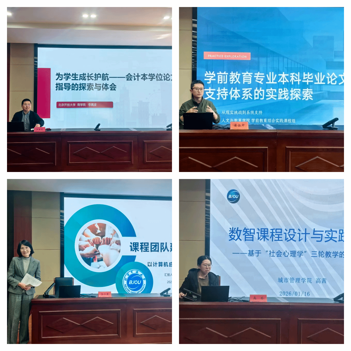 会上,四位来自不同学院的教师代表先后作交流分享。李高波老师围绕会计学本科学位论文指导,系统阐述了指导工作的价值理念、具体实践路径及实施成效。黄振中老师聚焦学前教育本科专业毕业论文指导的实践,介绍了集中指导与个性化辅导相结合的模式及资源整合路径。吕小星老师以计算机应用基础课程团队为例,分享了团队从组建、运行到聚焦AI赋能教学与课程思政融合的建设经验与实践成效。高茜结合“社会心理学”教学实践,系统汇报了基于数智平台的三轮教学改革历程,涵盖课程设计、策略迭代与教学成效优化等方面。