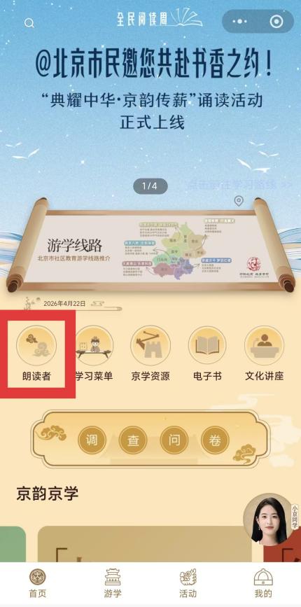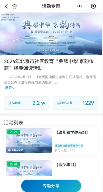 作为本次活动的线上主阵地,我校微信小程序“京学坊”迅速成为市民云端诵读的“热门打卡地”。自4月20日全民阅读周正式启动以来,截至4月22日,“朗读者”专题累计访问量已突破2.2万人次,报名人数达1000多人,覆盖幼儿、青少年、成人、银龄及亲子五大组别。诵读篇目涵盖经典诗词、散文名篇与传统蒙学,传承中华文脉,厚植家国情怀。以朗读促城教融合,以文化助社区治理。篇目短小精悍,语言优美,兼具思想性与感染力,在声声诵读中涵养文化自信,凝聚精神力量。