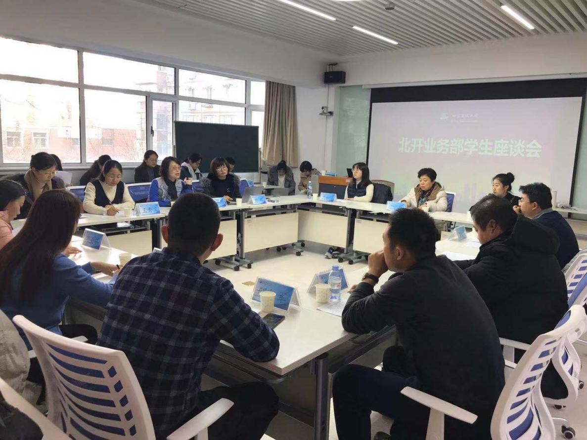 为贯彻北开业务部党总支“不忘初心 牢记使命”主题教育“以学生为中心”要求,持续深入了解学生的学习状态和学习需求,继新生座谈会召开后,北开业务部于12月7日组织召开了在读学生座谈会,来自不同专业、不同教学单位的13名学生代表参加了座谈。会议由北开业务部主任张琳琳主持,北开业务部党总支书记王秀凤、副主任周晖、副主任李继梅、各学院负责人、相关专业责任教师及教务管理人员参加会议。