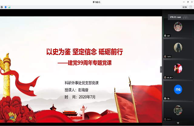 7月7日下午,科研外事处党支部举办建党99周年专题党课,党支部书记彭海蕾以《以史为鉴 坚定信念 砥砺前行》为题,为科研外事处全体党员在线讲授了一堂别开生面的党课。